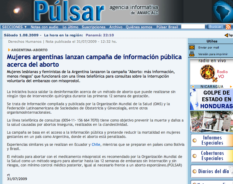 Media launch safe abortion hotline Argentina 2009