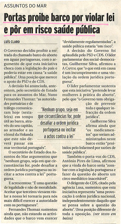 Portas proibe barco por violar lei e pôr em risco saúde pública