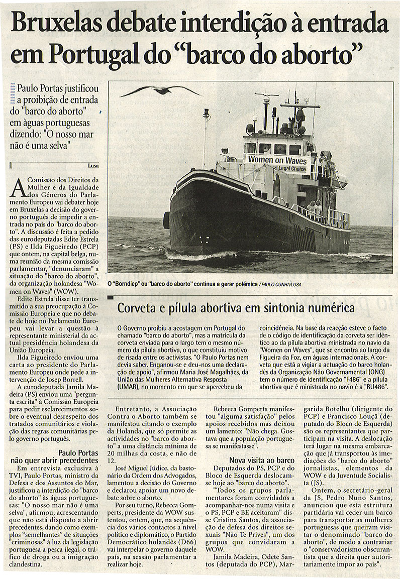 Bruxelas debate interdição à entrada em Portugal do "barco do aborto"