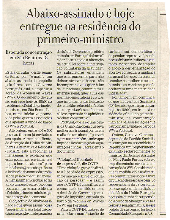 Abaixo-assinado é hoje entregue na residência do primeiro-ministro