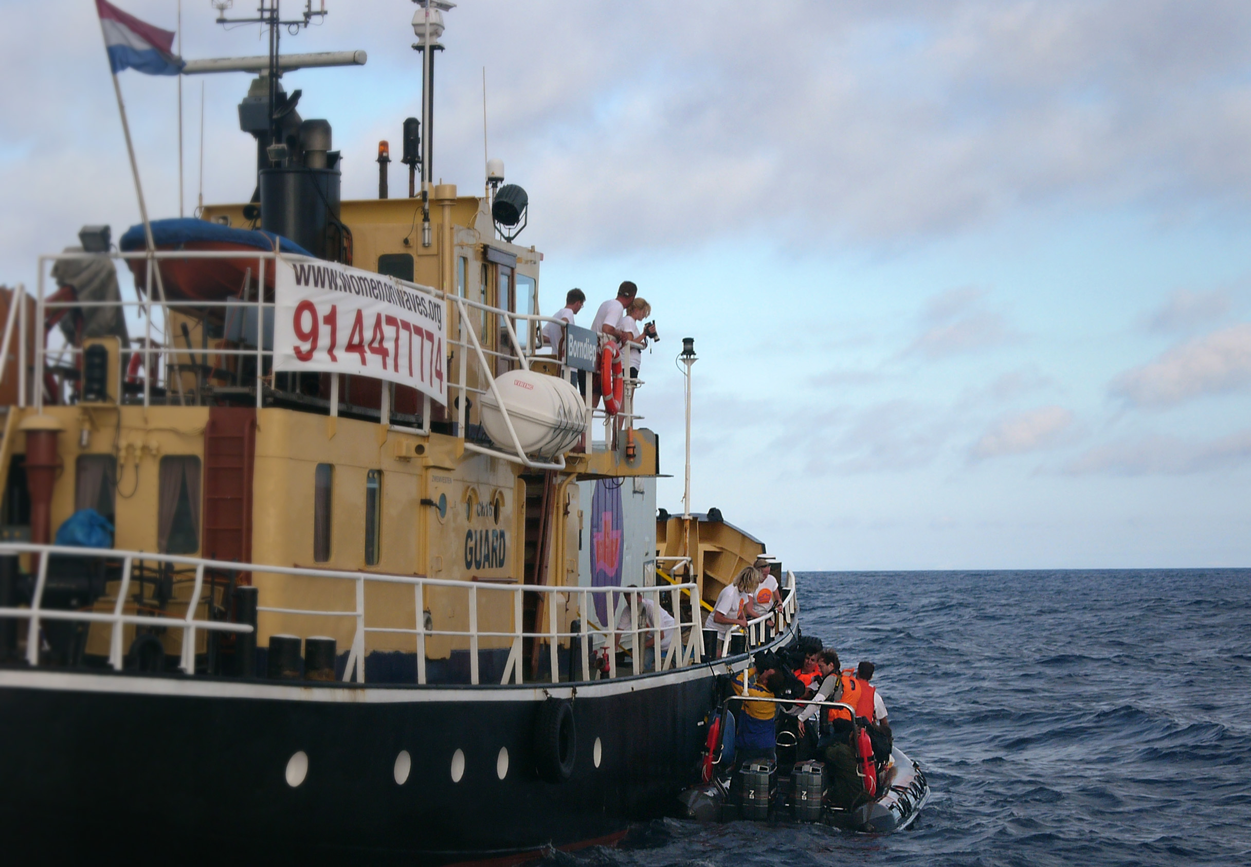 29th of August, 2004: Bringing fresh food to the crew of the Ms. Borndiep. Photo by Nadya Peek for Women on Waves.