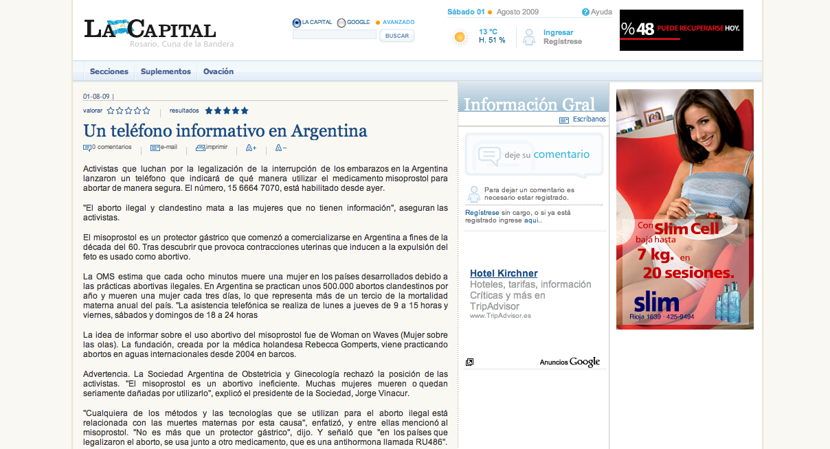 Media launch safe abortion hotline Argentina 2009